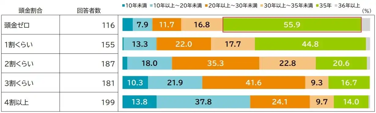 借入期間についても、頭金ゼロでは「35年」での借入れが55.9%と半数を超えており、他と比較しても突出しています(図表6)。頭金割合が増えるにつれて、借入期間が短くなる傾向があり、特に頭金2割以上では、「35年」の借入期間の選択割合が急減しています。 |