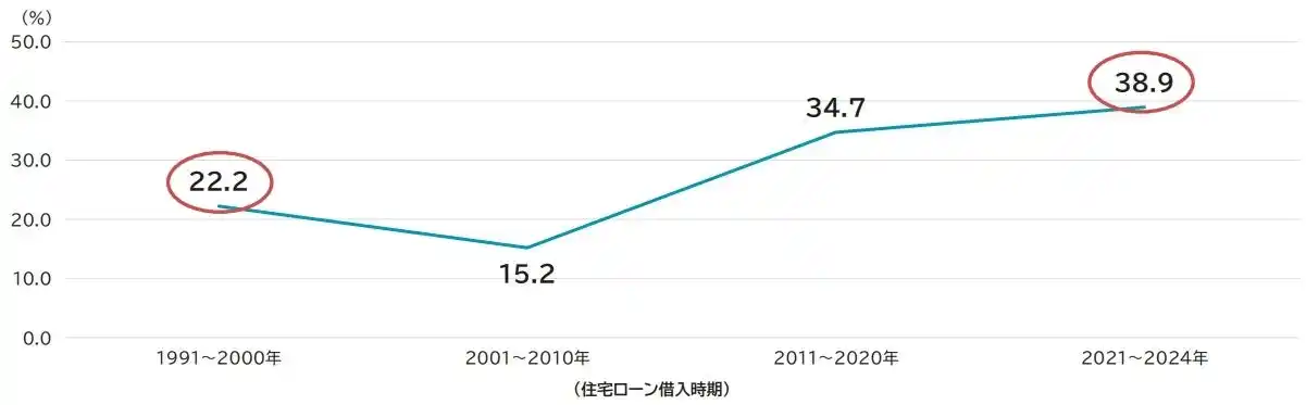 住宅ローン借入時期ごとに頭金割合を比較すると、時代とともに変化していることが分かります。 |