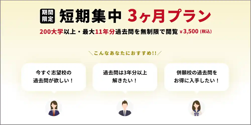 このたび、過去問対策の本格シーズンに向けて、「入試正解デジタルプレミアム」にて期間限定で「短期集中3ヶ月プラン」3,500円(税込)の販売を開始します。(2026年3月25日までの期間限定販売) |