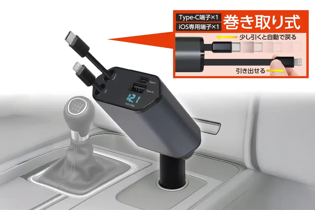 | 特徴:少し引くと自動で戻る!とっても便利な巻き取り式カーチャージャー!「type-A・type-C×2・iOS端子」を備えて4台同時充電可能!車のバッテリー電圧表示付きでバッテリー交換時期を常時チェックできます。支柱から約170°前後回転でき好きな角度に調節できます。あると便利なチャージャーをスマートに備えよう! | |||||||||