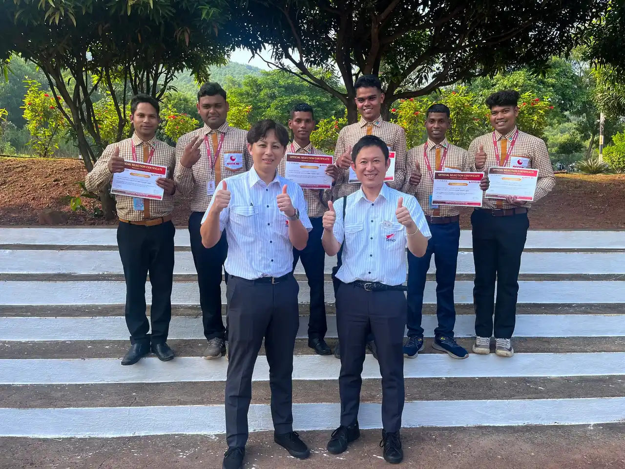 セイノースタッフサービスによる面接と選考を経て、選ばれたインド人トラックドライバー候補者6名と記念撮影。インド代表としての誇りを胸に、日本の物流業界で新たな道を切り開く有志たちの姿がここにあります。 |