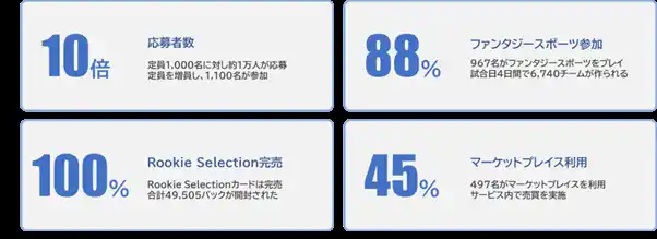 βテスト期間中には、合計49,505パックのカードが開封され、βテスト参加者のみを対象とした限定セット「Rookie Selection」は全13,974パックが完売となるなど、コレクション要素への高い熱量が確認されました。加えて、サービス内マーケットプレイスでの取引も活発で、参加者の約45%にあたる497名が他ユーザーとのカード売買を体験。二次流通を通じたファン同士の交流や戦略的なコレクション形成など、本サービスならではの楽しみ方が広がりました。 |