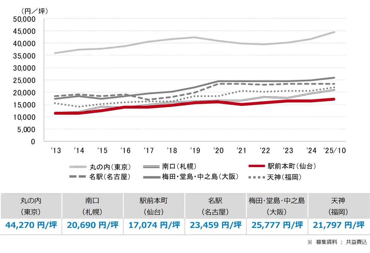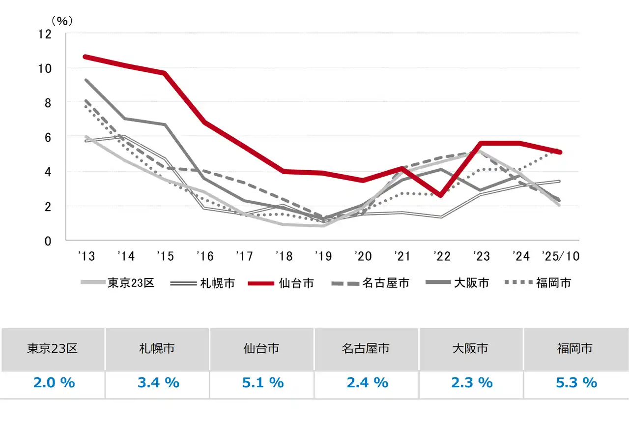 三幸エステート株式会社(本社:東京都中央区、取締役社長:福島正二郎)は、2025年10月度の仙台市オフィス賃貸状況(空室率&現空面積:全規模、募集賃料&募集面積:全規模、規模別空室率、主要エリア※1空室率:全規模)および全国6大都市(東京・札幌・仙台・名古屋・大阪・福岡)の大規模ビルのマーケットデータをまとめた「オフィスマーケット2025年11月号仙台」を公表します。 |