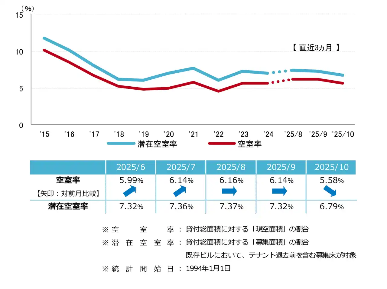 空室率は前月比マイナス0.56ポイントの5.58%となり、前月から大幅に低下した。主要エリアでの分室の開設や取壊し予定ビルでの外部募集の停止が主な低下要因となっている。規模別では「大規模」が前月比マイナス1.0ポイントの大幅な低下となった。潜在空室率は前月比マイナス0.53ポイントの6.79%だった。 |