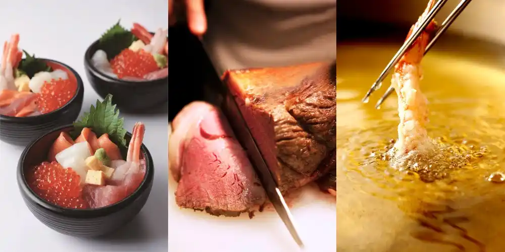 ホテルの王道メニューも豊富なラインアップでご用意しました。いくらやマグロなど、お好みの海鮮がのせ放題のオリジナル海鮮丼やホテル伝統のローストビーフ、ほんのり甘いタレが食欲をそそるすき焼き丼に揚げたての天麩羅など、ライブ感あふれるシェフのクッキングサービスで出来立てを提供するほか、ニューオータニ自慢の和・洋・中のメニューをお愉しみいただけます。 |