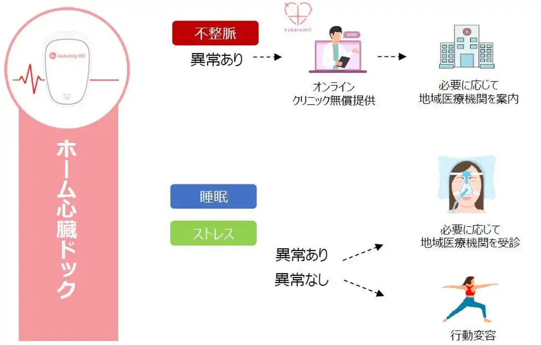 異常が検出された場合、当社が負担する形でオンラインクリニック受診を無償提供。必要に応じて地域の基幹病院へ紹介状を発行 |