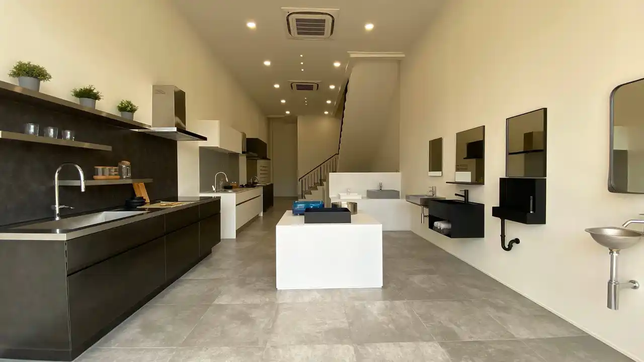 商業施設のグリーンヒルズモール内に開設された約120平方メートル のショールームに、現地で需要の高いステンレスキッチンや洗面台などを含む約50点の商品を展示しています。ミニマルデザインと機能性を融合させた当社商品の特長や質感、使い心地をお確かめいただけます。 |