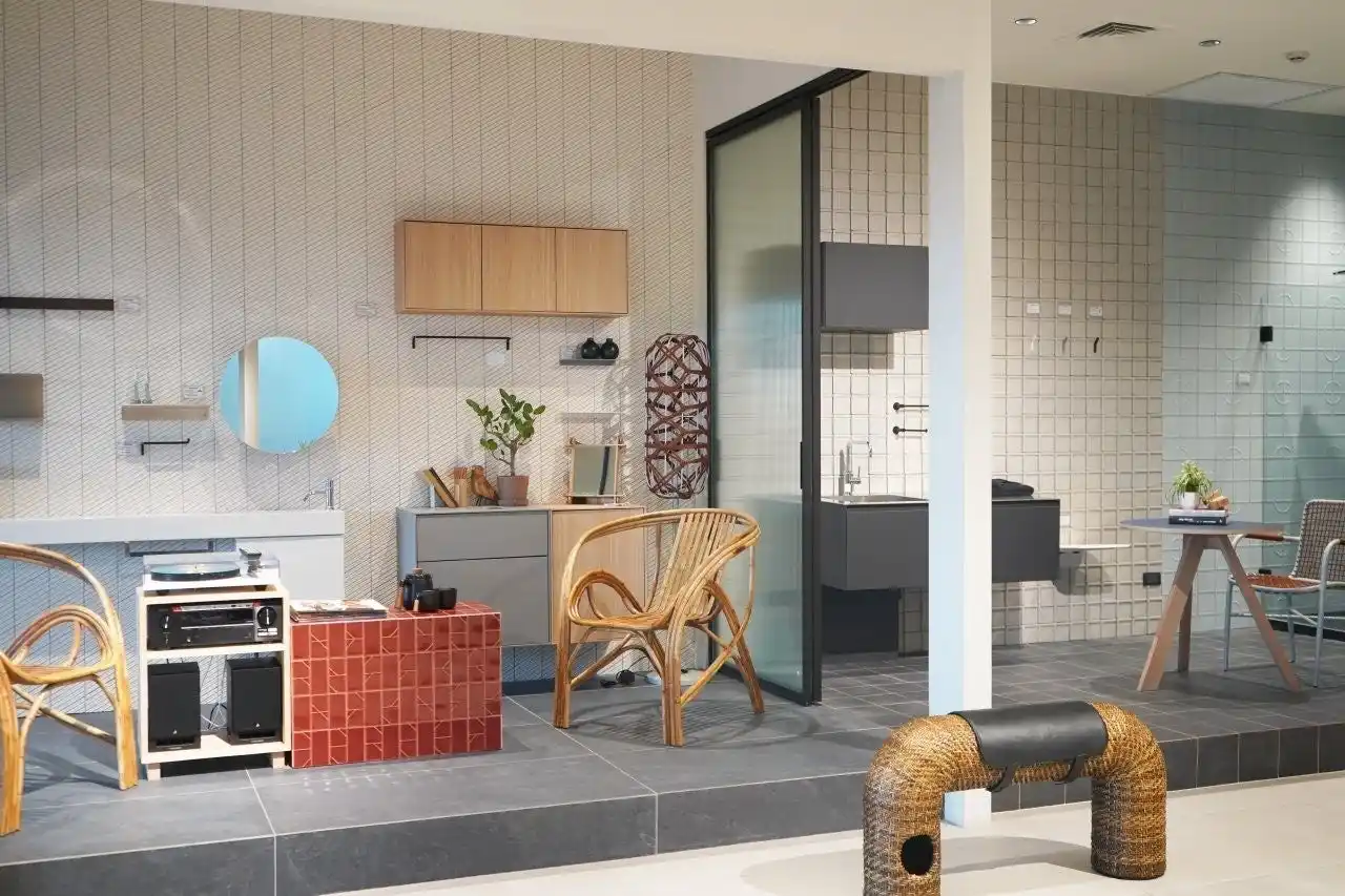 本イベントは、開業を記念して開設されたポップアップスペースから開始しました。当社代表取締役社長 山根太郎とDexterton社代表 Audrey Go氏が登壇し、新ショールームの魅力などをテーマにしたトークを展開。その後店舗前に移動して実施したリボンカットには、フィリピンの人気女優Belle Marianoさんも参加し、華やかなセレモニーが行われました。ショールームには、お招きした建築業界関係者約120名がご来場され、商品を熱心にご覧になるお客様で賑わいました。 |