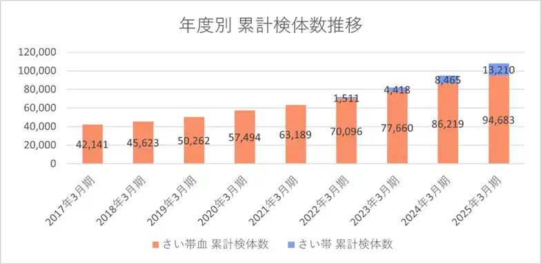 | 1999年の設立以来、当社は民間さい帯血バンクのパイオニアとして日本におけるさい帯血保管事業を牽引してきました。現在、国内シェア99%を誇り、2025年3月期には「さい帯」および「さい帯血」の累計保管実績が10万件を超えています。この数字は、長年にわたり多くのご家族から寄せられた信頼の証です。 | |||||||||
