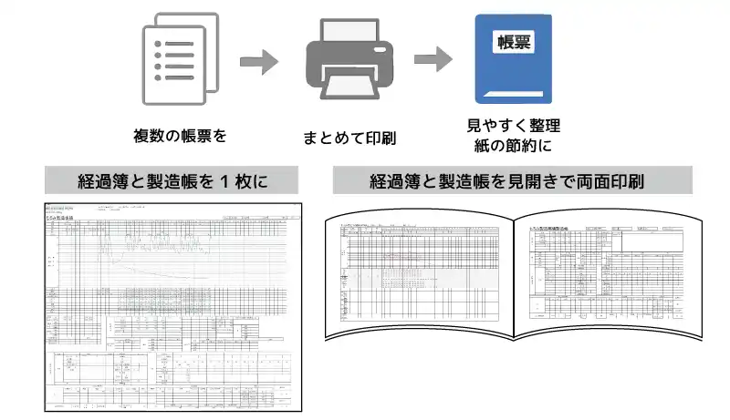 もろみ製造帳と経過簿を事績ごとにまとめて印刷でき、効率的なファイリング管理がおこなえます。 |