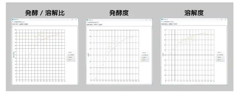 発酵の可視化に役立つ「溶解度」「発酵度」「発酵/溶解比」をアプリで自動算出し、グラフ表示や目標との比較がおこなえます。 |