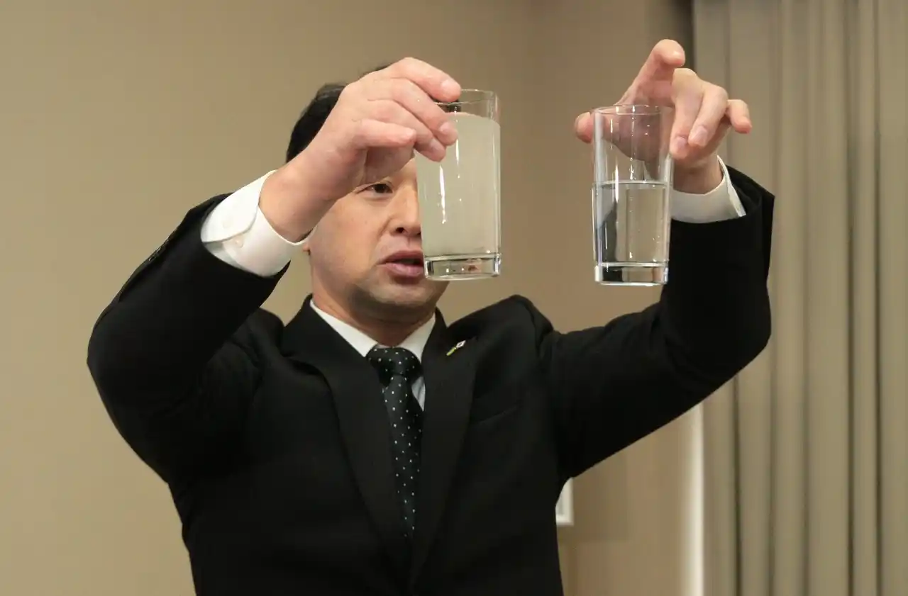 写真左:処理前の水(海水)、写真右:処理後の水(淡水) |