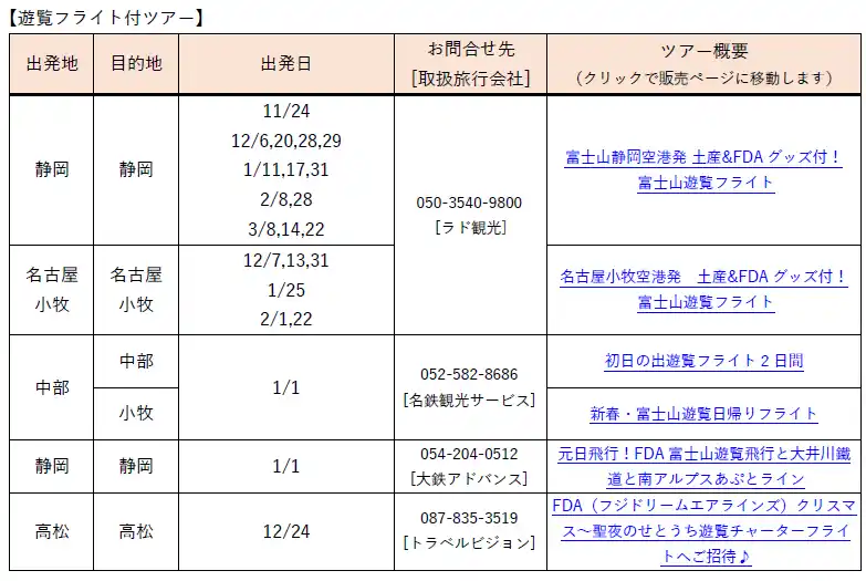 | ※上記は、現在一般販売している旅行ツアーの一部となります。全てのチャーター便・遊覧フライトの運航予定を記載しているものではありませんのでご了承ください。 | |||