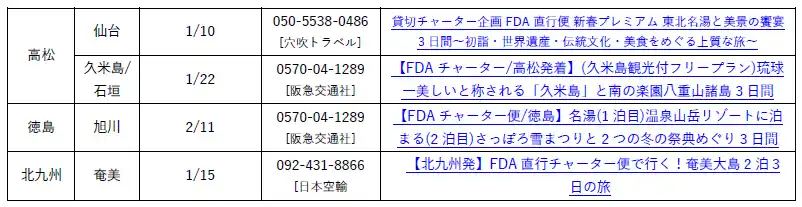 | 現在募集中の、FDAチャーター便を利用した旅行ツアーのご案内です。 | |||