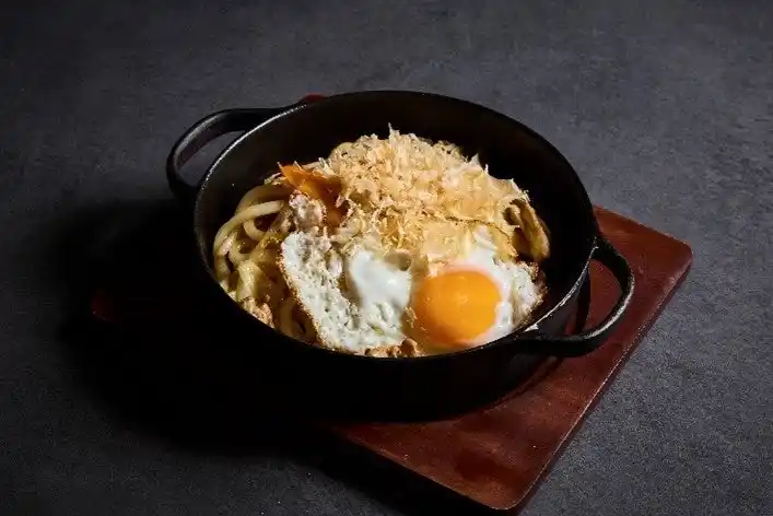 卵が映える「鉄板熱盛焼うどん」 |