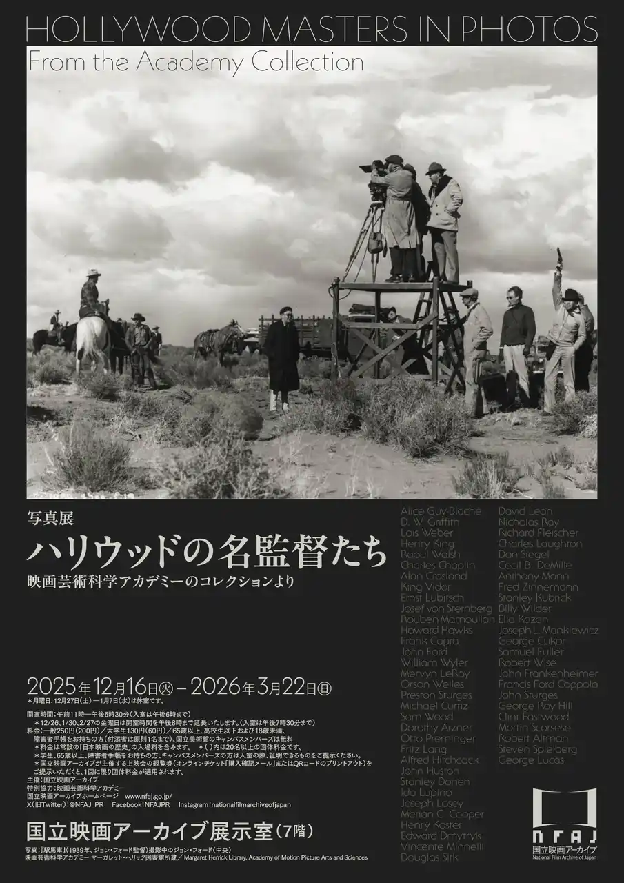 | アカデミー賞の開催で知られるアメリカの映画芸術科学アカデミーは、映画のアーカイブ機関や映画資料の収集・保存を専門とする図書館も擁している組織です。本展覧会は、同アカデミーの膨大な写真コレクションより黄金期ハリウッドの名監督や伝説的なスターの撮影現場を収めたスナップ写真などを公開し、当館が所蔵するポスター資料などの資料も一堂に会することで、アメリカ映画の最も香気あふれる時代を再現します。 | ||||||||||||||||||