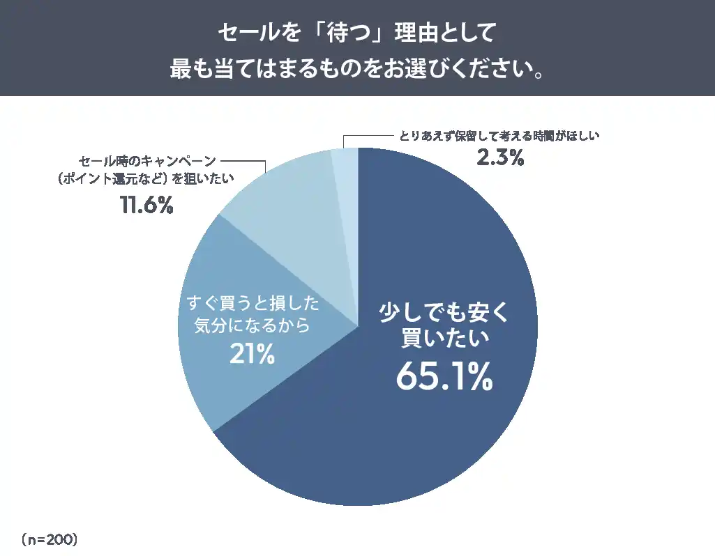 セールを待つ理由として最も多かったのは「少しでも安く買いたい」(65.1%)。 |