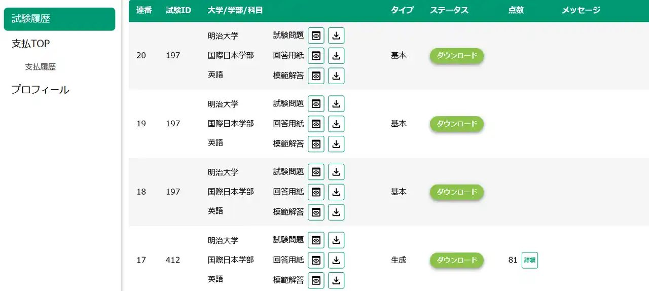 問題生成&解答用紙ダウンロード: 志望校と分野を選択し、問題を生成。PDF形式の問題と、専用解答用紙をダウンロード・印刷します。 |