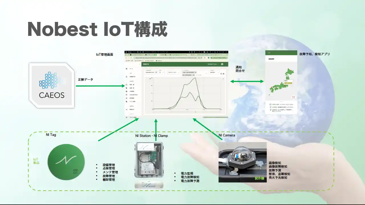 Nobest IoTは、電流・位置・履歴をデジタルで統合し、エネルギーと設備の持続可能な運用を支えます。クラウド連携によるリアルタイム制御、そして独自のAIシステム「CAEOS(ケイオス)」による故障予測・最適化管理まで、すべてをワンプラットフォームで実現します。 |