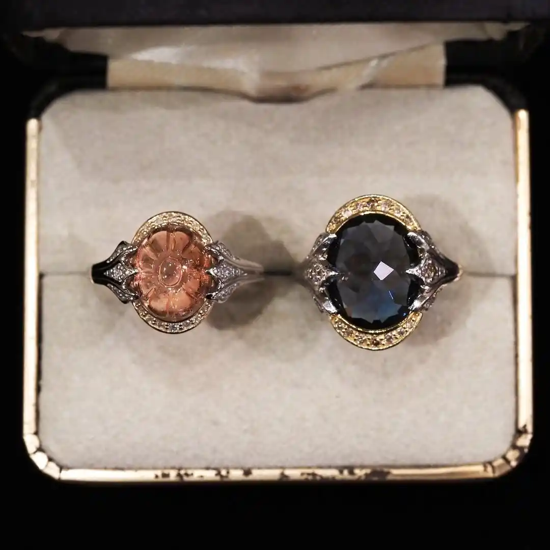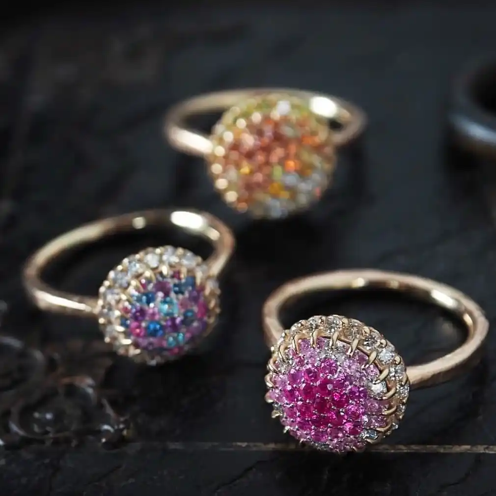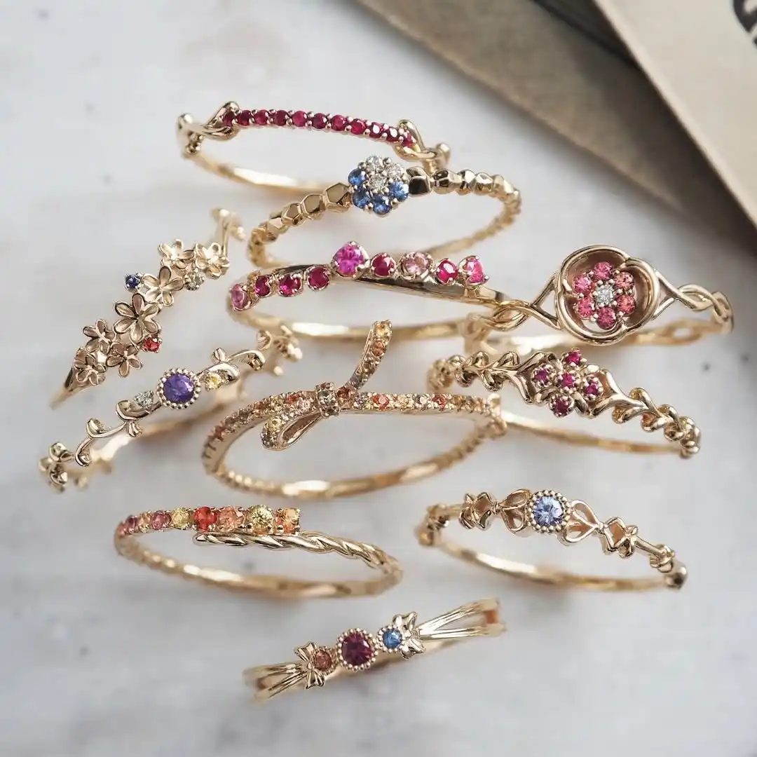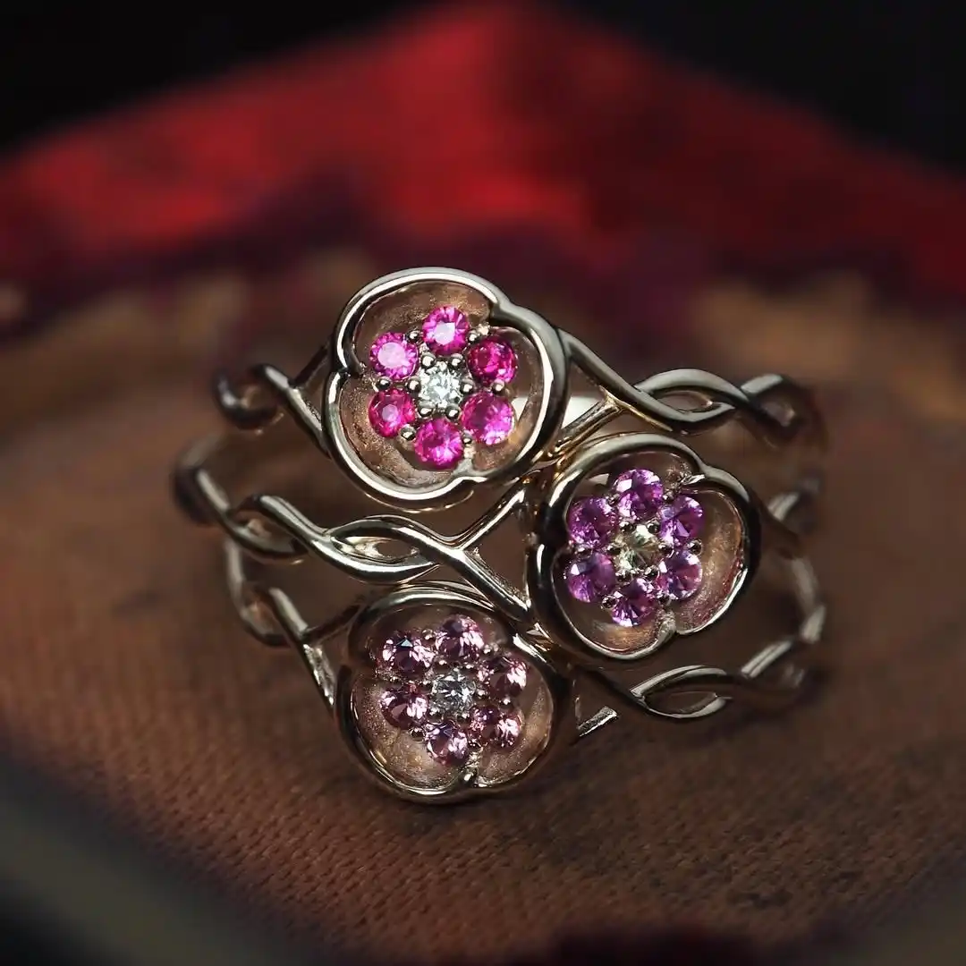 蓮や小花、リボンなど、それぞれのモチーフに合わせて、グリーンからイエロー、オレンジへのグラデーションを施したものや、深いブルーやピンクで鮮やかにまとめたものもございます。 サファイアやルビーならではの眩い輝きと発色の良い彩りが加わることで、デザインごとの繊細さや愛らしさがいっそう際立ちました。 |