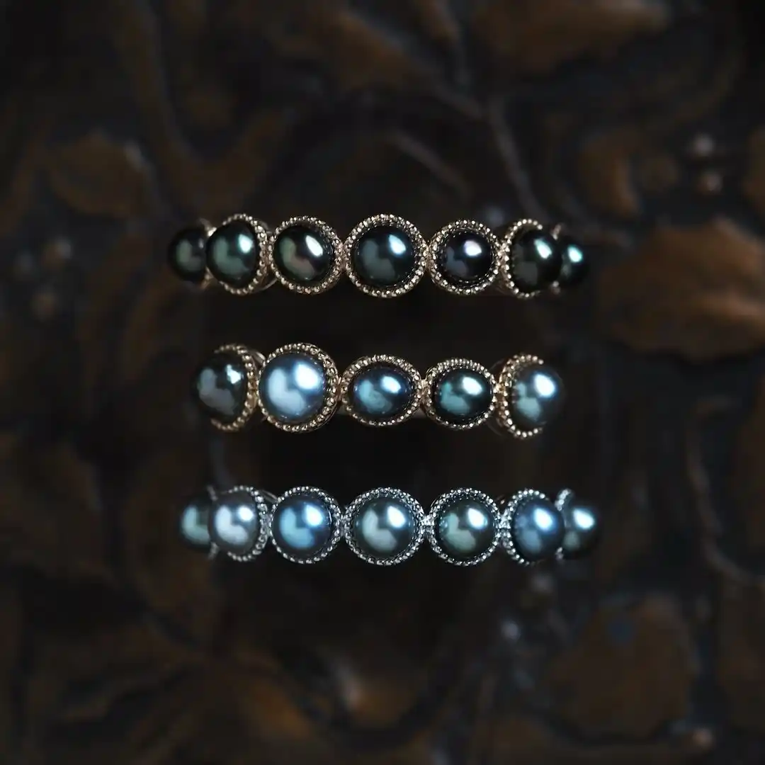 一珠一珠に自然の美しさが映り込む、ガンビエ産黒蝶真珠を贅沢にあしらった「Mille Chainon Perle(ミルシェノン ペルル)」。グレーやブルーのニュアンスを含み、自然が生み出した神秘的な色彩をご覧ください。 |
