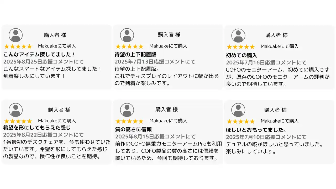 COFO(コフォ)は2016年、千葉県山武市にて設立。「リラックス×集中力」を開発理念とし、豊かな暮らしを支える「理想の自分空間創り」のアイテムをお届けしています。これまでに「COFO Chairシリーズ」「COFO Deskシリーズ」「COFO無重力モニターアームPro」を発表し、いずれも同分野でMakuake歴代No.1*を獲得(*自社調べ、2025年10月31日時点)。「COFO無重力モニターアームPro」は、日本、アメリカ、フランス、ドイツの4カ国にて国際デザイン賞を受賞。 |