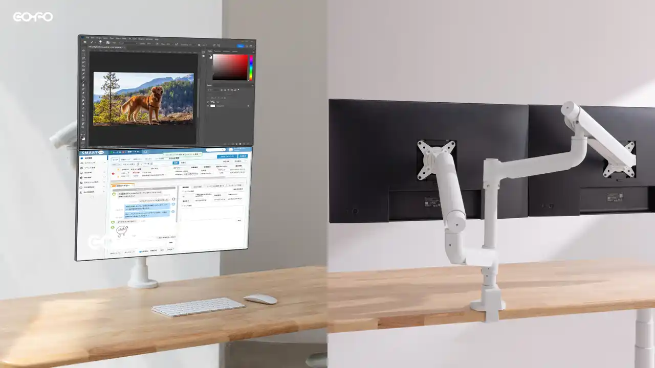 COFO無重力モニターアームPro(上下配置版)は、モニターを上下でも、左右でも配置が可能。その日の作業やデスク環境に合わせて、作業空間をアップデートできます。 |