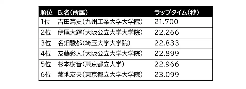 タイムアタック大会におけるラップタイム上位6名(学生参加者)の成績です。上位者には日本知能情報ファジィ学会事業委員会公認の電子表彰状を授与しました。詳細は、FSS2025公式HPをご参照ください。 |
