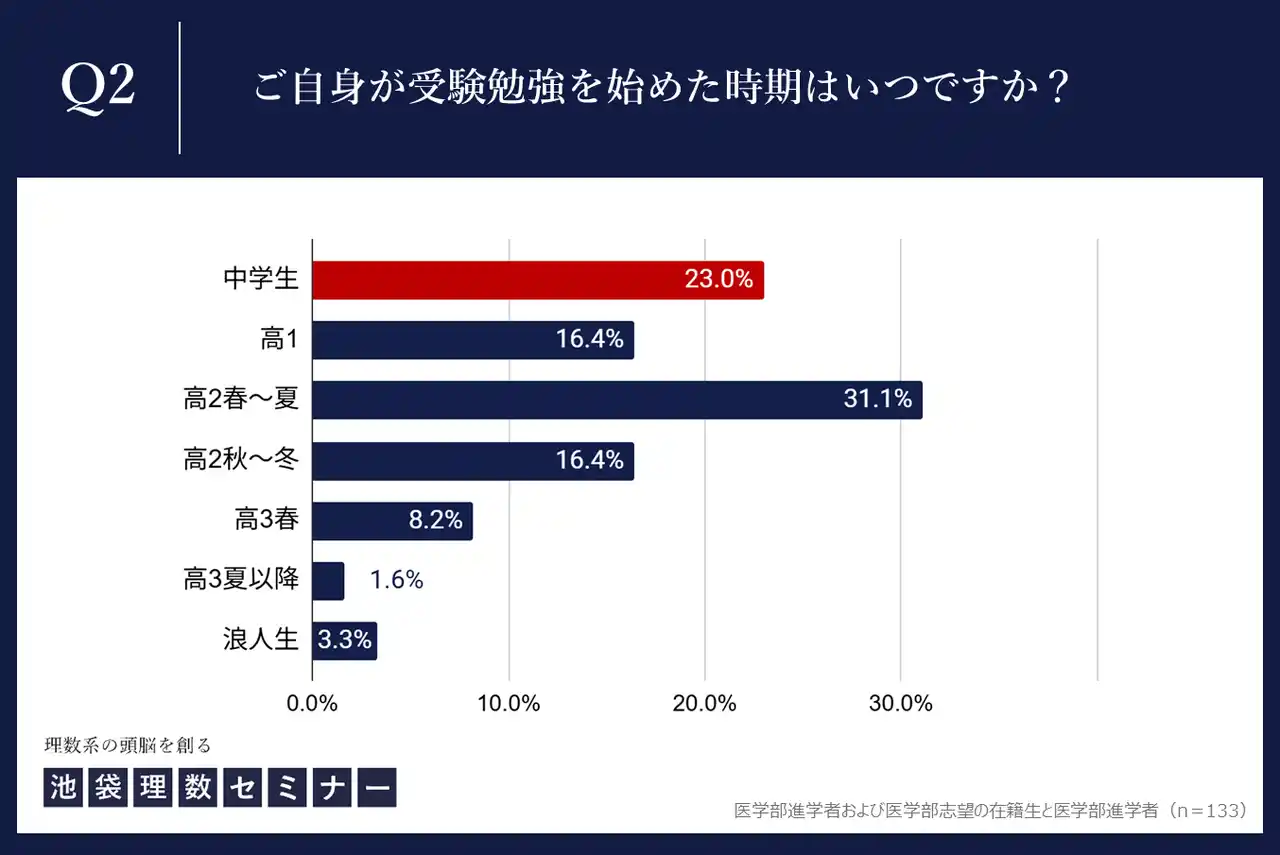 このことから、医学部という最難関の受験を突破した、あるいは目指している生徒たちは、早期からの対策が合格の鍵を握ると強く認識していることが伺えます。 |