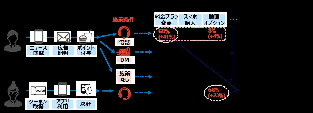 ♦お客さまデータの「4W1H(誰が/いつ/どこで/何を/どうした)」形式への統合、LAM構築、ならび に販促施策での効果検証※1はドコモが担当し、テレマーケティングを通じたモバイルおよびスマー トライフ関連サービスの受注率が、従来比で最大2倍に向上する効果を確認しました。 |