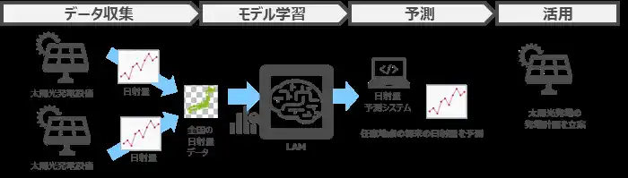 気象現象に関する衛星観測値や地上観測値も、時系列データとして記録されています。太陽光発電事業者は、これらの時系列データを用いて将来の日射量を予測し、発電計画を立案し、小売電気事業者と電力を取引しています。地理的に隣接する太陽光発電設備の発電量の変動には、雲の動きや位置による日射量への影響が反映されており、これらのパターンの解析は日射量の予測精度向上に有用です。そこで、LAMを活用した日射量予測の応用にも取り組んでいます(図7)。 |