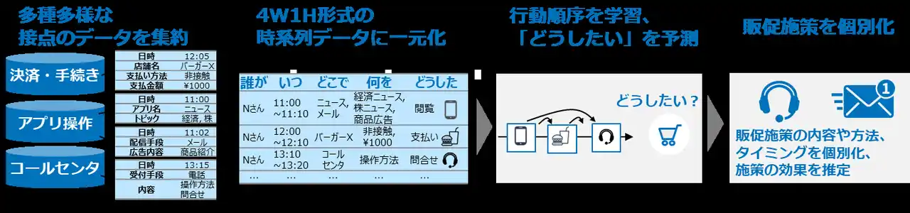 1to1マーケティングを効果的に実現するには、日々の多様なお客さま接点から得られる時系列の行動データを活用し、商品購入やサービス契約に至るまでの一連のプロセス(カスタマージャーニー)を踏まえたニーズの把握が不可欠です。しかし、接点ごとにデータの頻度や形式が異なるため、時系列データの統合と分析には技術的な課題がありました。例えば、アプリでは高頻度な操作履歴が蓄積される一方、店舗では購入商品や支払い手段などの低頻度なデータが中心です。これらを統合的に扱うことは困難であり、さらに、接点の組み合わせや順序まで考慮してお客さま理解を深めようとすると、分析の複雑性と計算コストが大幅に増加してしまいます。 |