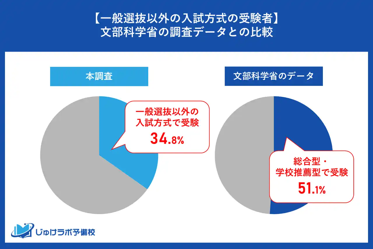 今回の保護者調査では、一般選抜以外の入試方式で受験したという回答が34.8%にのぼり、大学入試の選択肢が多様化している実態が明らかになりました。 |