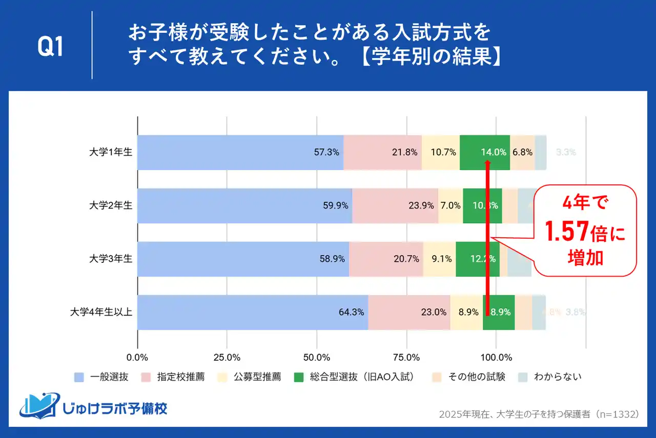 大学4年生以上の保護者の64.3%が経験した「一般選抜」が大学1年生では57.3%にまで減少。一方で「総合型選抜」は8.9%から14.0%へと急増する結果に。最新の入試トレンドの変化とは。