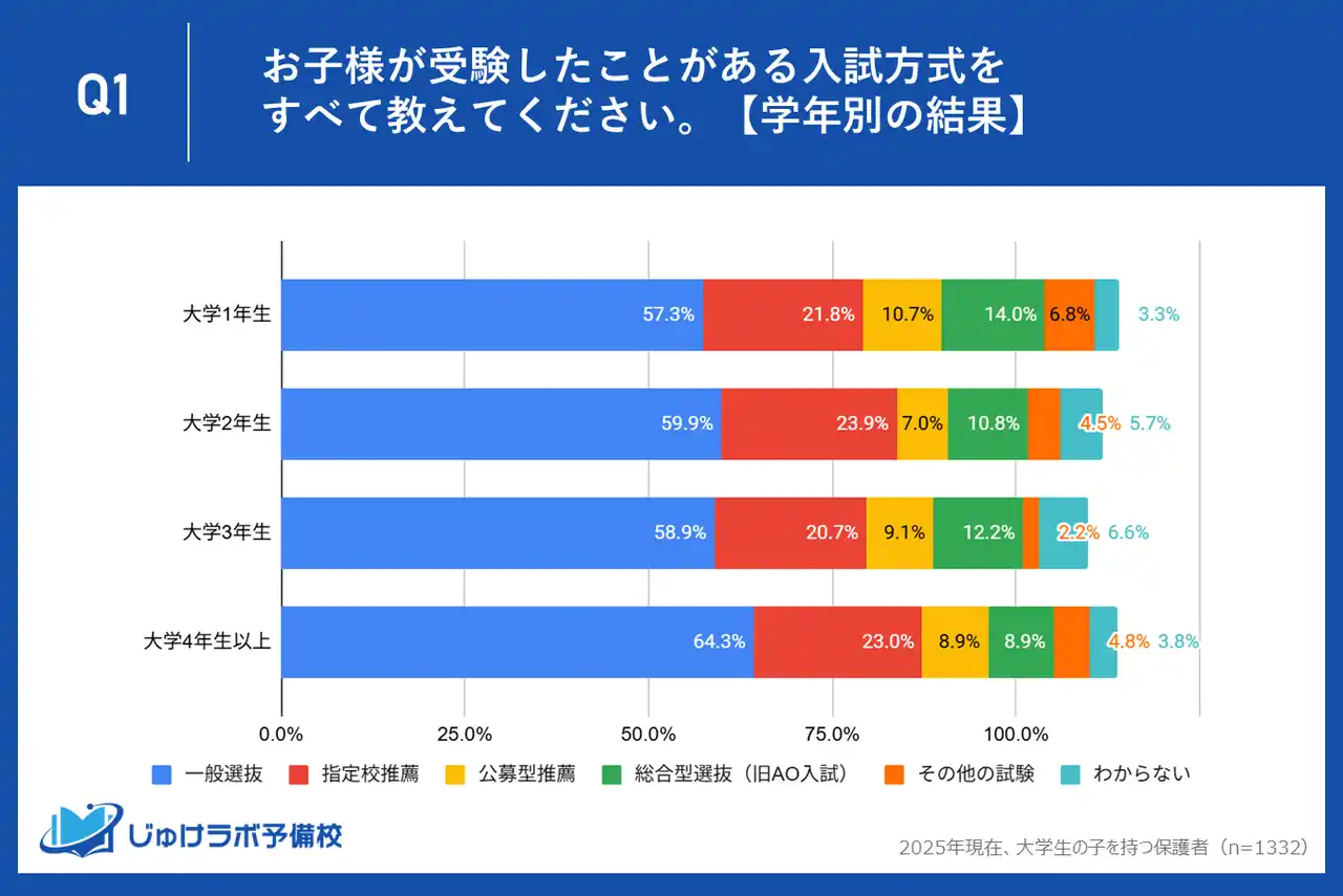 今回の調査で最も注目すべきは、学年別の入試方式の傾向です。大学4年生以上のお子様を持つ保護者の回答では64.3%だった「一般選抜」の受験率が、大学1年生の保護者では57.3%と、7%も減少していることが判明しました。 |