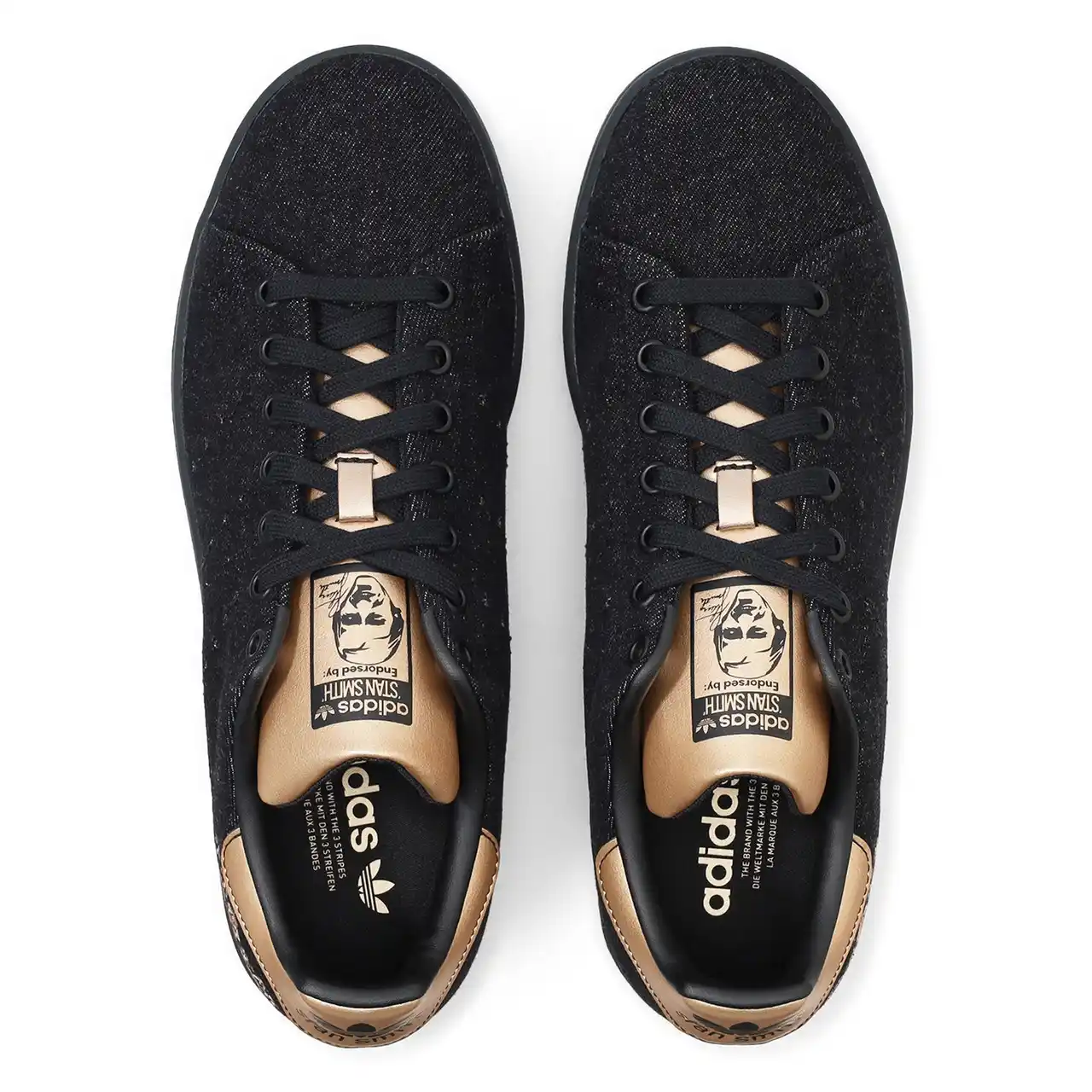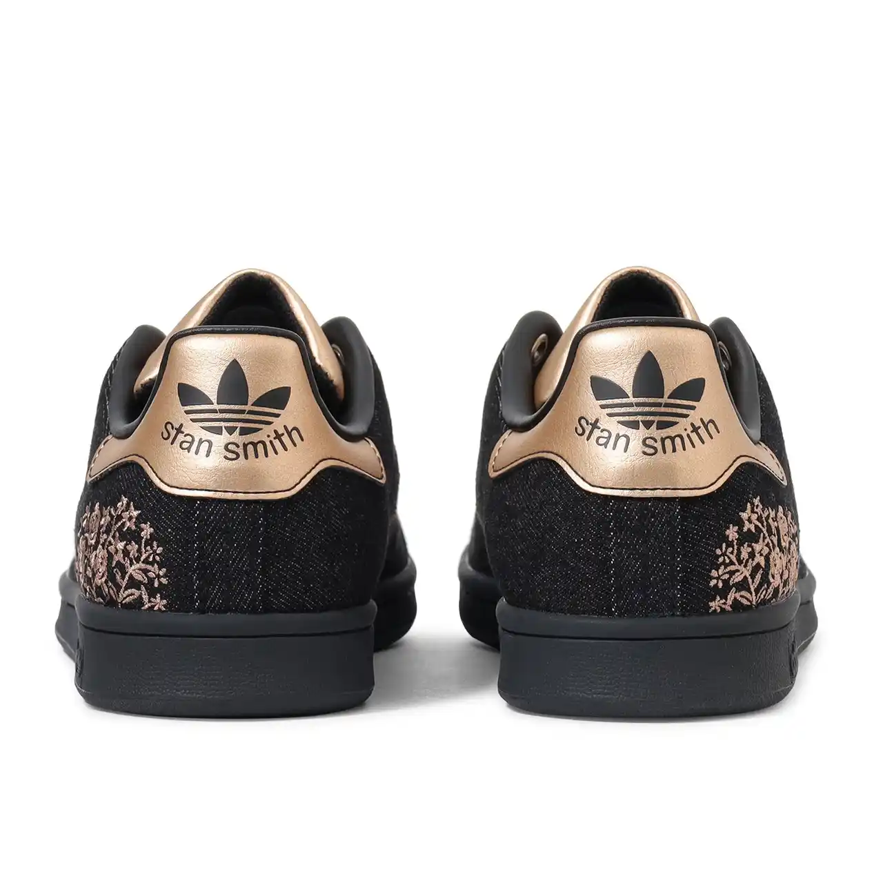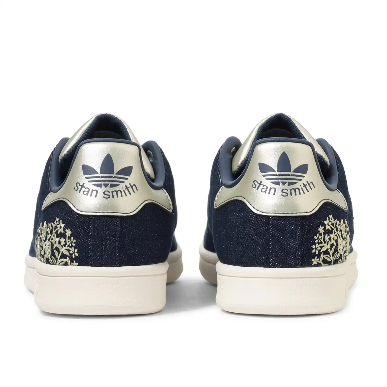 今回新発売の 「STAN SMITH DENIM」では、デニム素材を使用し普段よりも大人っぽい見た目に仕上げながら、ヒール部分にはボタニカル柄の刺繍で程よい遊び心を演出しています。暗めのネイビーとブラックの二色をベースに、ゴールドとブロンズの異素材が組み合わさったヒールパッチとシュータンは、カジュアルさと上品さを合わせた特別仕様のデザインです。 |