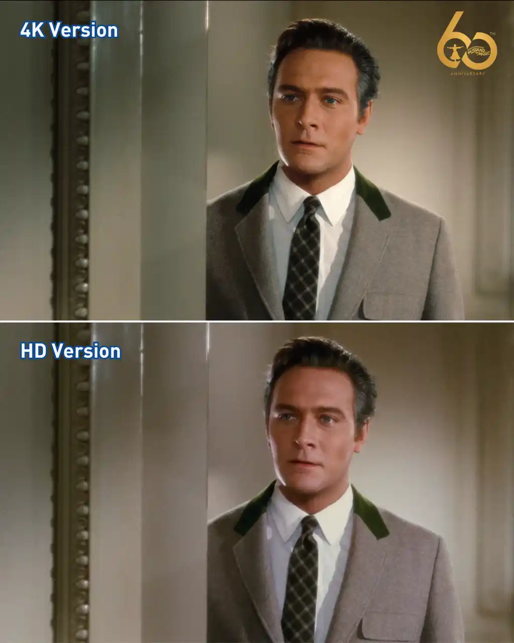 もともとのオリジナル素材と、初の4Kデジタルリマスターの素材を比較できる画像が公開されました。ただ明るくしただけでない、本来意図されていた映像へのリマスターを心がけたという修復チームの言葉通り、4Kリマスターの画像では深みがある鮮明な味わいを感じられます。ぜひ大スクリーンで味わっていただきたい映像です。 |