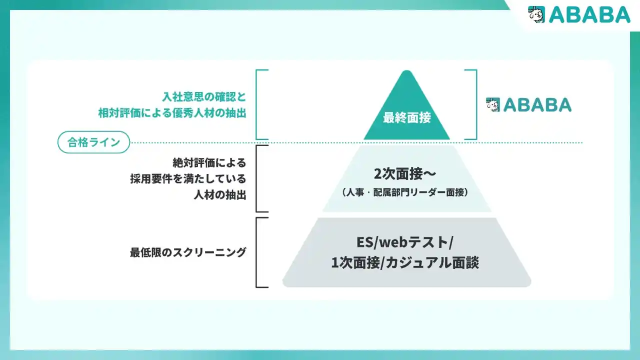 一般的に最終面接の役割は、採用要件を満たしている学生の中から入社意思の確認や相対評価を通して採用する人材を抽出することとされています。 |