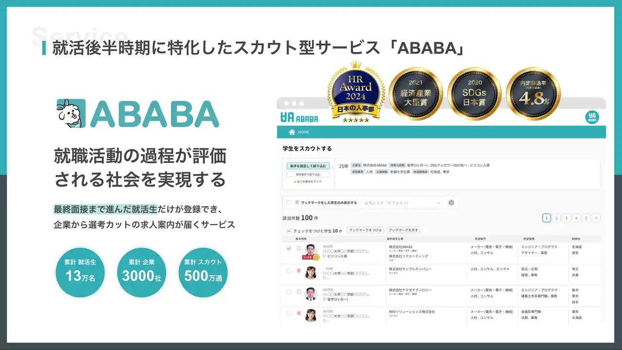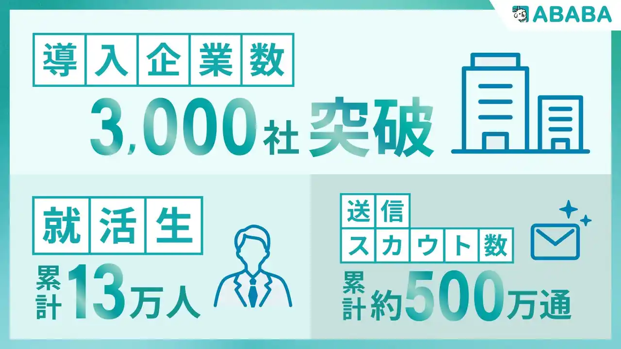 株式会社ABABA(本社:東京都渋谷区、代表:久保駿貴・中井達也)は、就職活動の過程を評価したスカウトが届く『ABABA』の導入企業が累計3,000社を突破したことをお知らせします。 |