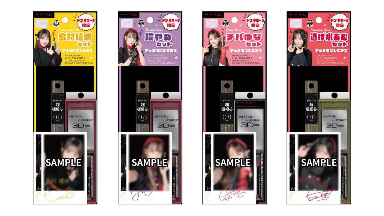 きゅるりんってしてみて×ドン・キホーテ ケイト アイブロウキャンペーンを記念し、2025年11月13日(木)よりドン・キホーテの対象店舗限定で数量限定にて「きゅるりんってしてみてメンバー別セット」を発売いたします。それぞれ下記の対象商品と撮り下ろし個人トレカと集合トレカが同封されております。