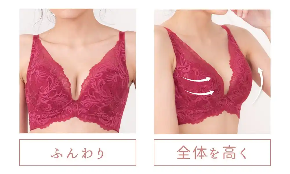 | また、「フェザーライクブラ」はバスト全体をやさしく包み込んで、中央に寄せることによって“ふんわり谷間”を実現してくれます。また、バスト全体を高く引き上げて、ナチュラルな“丸みシルエット”を叶えてくれます。 | |||