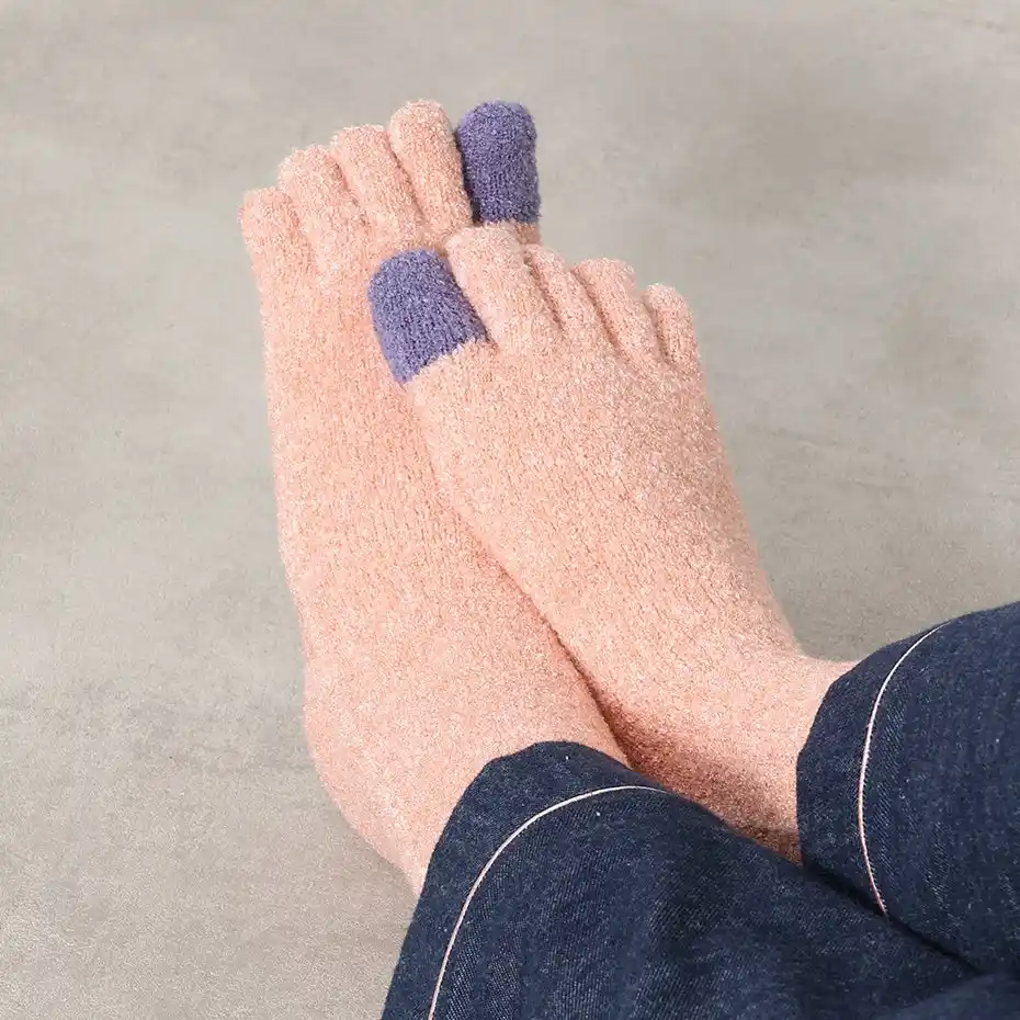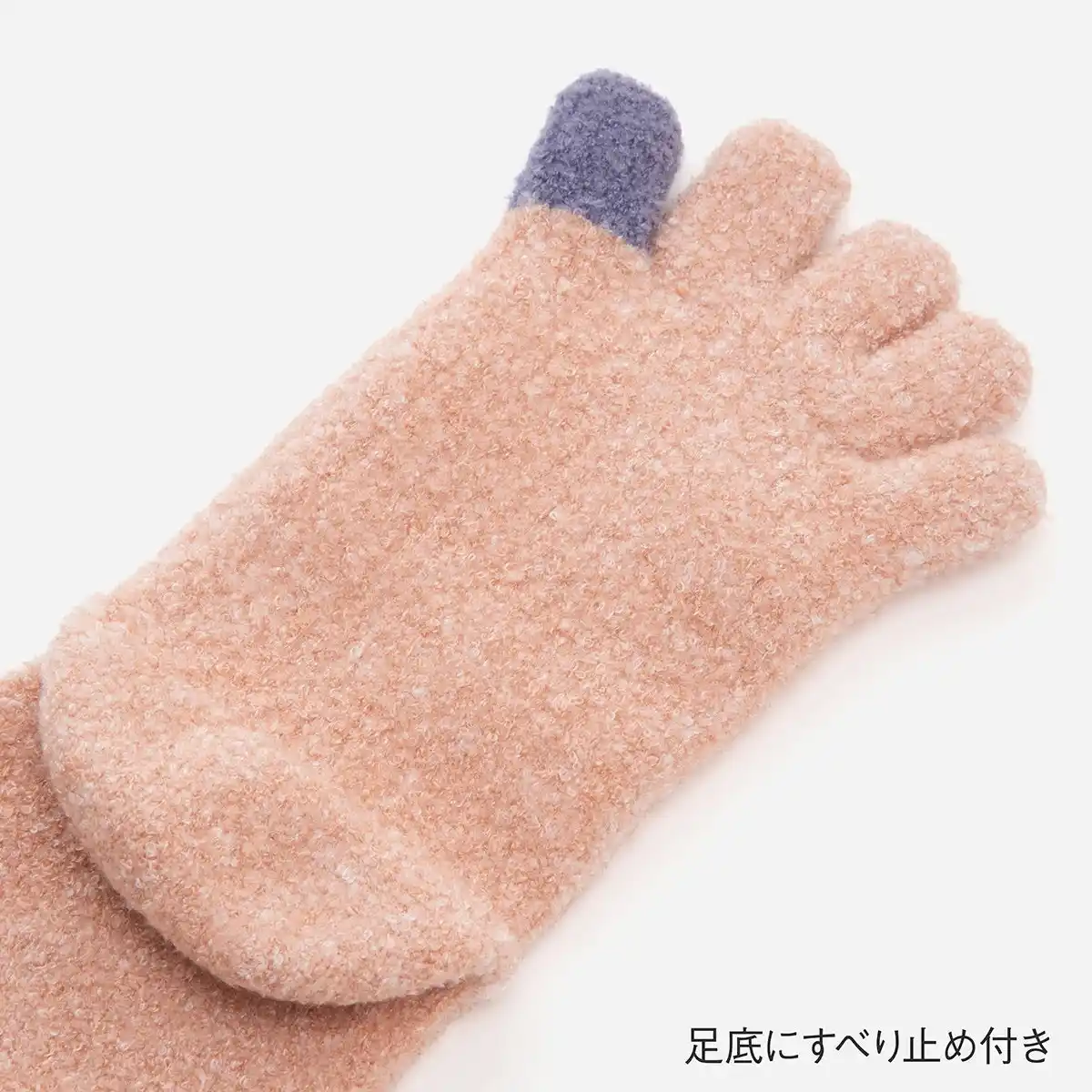 指先を1本ずつ包み込んであたためる5本指仕様のルームソックス。あったかやわらか裏起毛でふんわりとあたたかく、ずっと触っていたくなるような滑らかな肌触り。ハーブ成分(カモミール)と唐辛子成分(カプサイシン)を配合した「セルフヒーター加工※」で足元をしっかりあたためます。つま先の縫い目がないフラット仕様で、足底は滑り止め付きです。 |