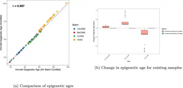 ComBat))を開発しました。 本提案手法は、すでに補正されたデータを再処理することなく、新たに追加されたデータのみを補正することを可能にします。 シミュレーション実験および複数のデータセットにおいて従来の手法とiComBatの比較を行った結果、ほぼ同等の補正能力が示唆されました。特に、アメリカ/フィリピンなど4つの独立したコホート研究から得られたデータセットに適用しエピジェネティッククロックを適用したところ、新しいバッチを追加すると従来法では既存サンプルのエピジェネティック年齢が変化してしまうものの、iComBatでは変化しないことが確認されました。 |