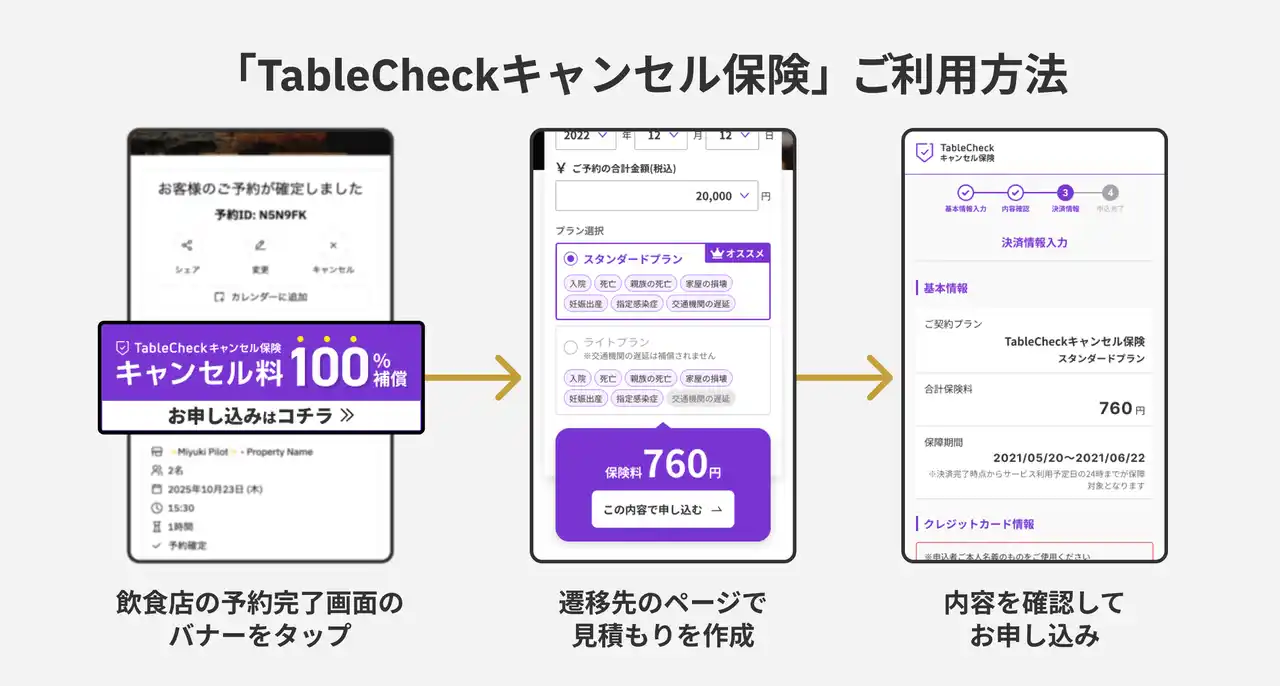 TableCheckの予約完了画面から、スムーズに保険申し込みが可能。
