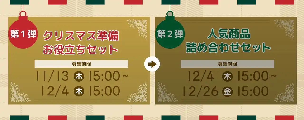 第1弾はクリスマスまでに届く「クリスマス準備お役立ちセット」をプレゼント! |