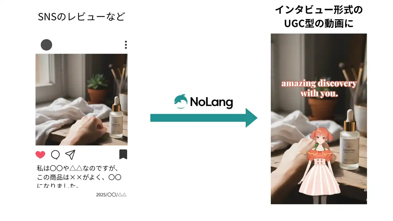 SNSのレビューにある画像などを用いてそのままUGC型の動画を作成することが可能。(サンプル動画:https://no-lang.com/video/f3e57f59-1f87-43ac-ad71-e4e6c01fb096?timestamp=20251113060430) |