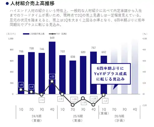 また、ハイエンド人材紹介は一般的な人材紹介に比べて内定承諾から入社までのリードタイムが長いため、現時点で第2四半期の売上計上見通しが一定程度立っておりますが、第2四半期は人材紹介売上高が6四半期ぶりに前年同期比でプラス成長に転じ、第1四半期との比較でも大きく伸長する見込みとなっております。 |