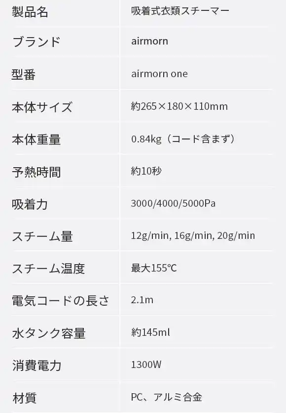 最大20g/minのスチームと5000Paの吸着力で、素材や衣類の状態に合わせて最適な仕上げが可能。厚手のコートから繊細なシルクまで、1台で幅広く対応します。 |