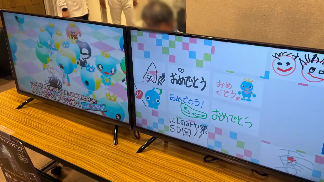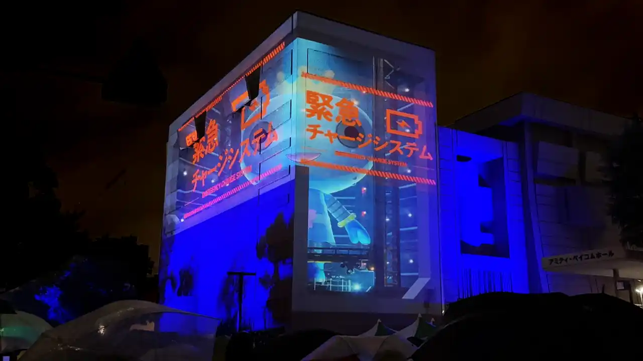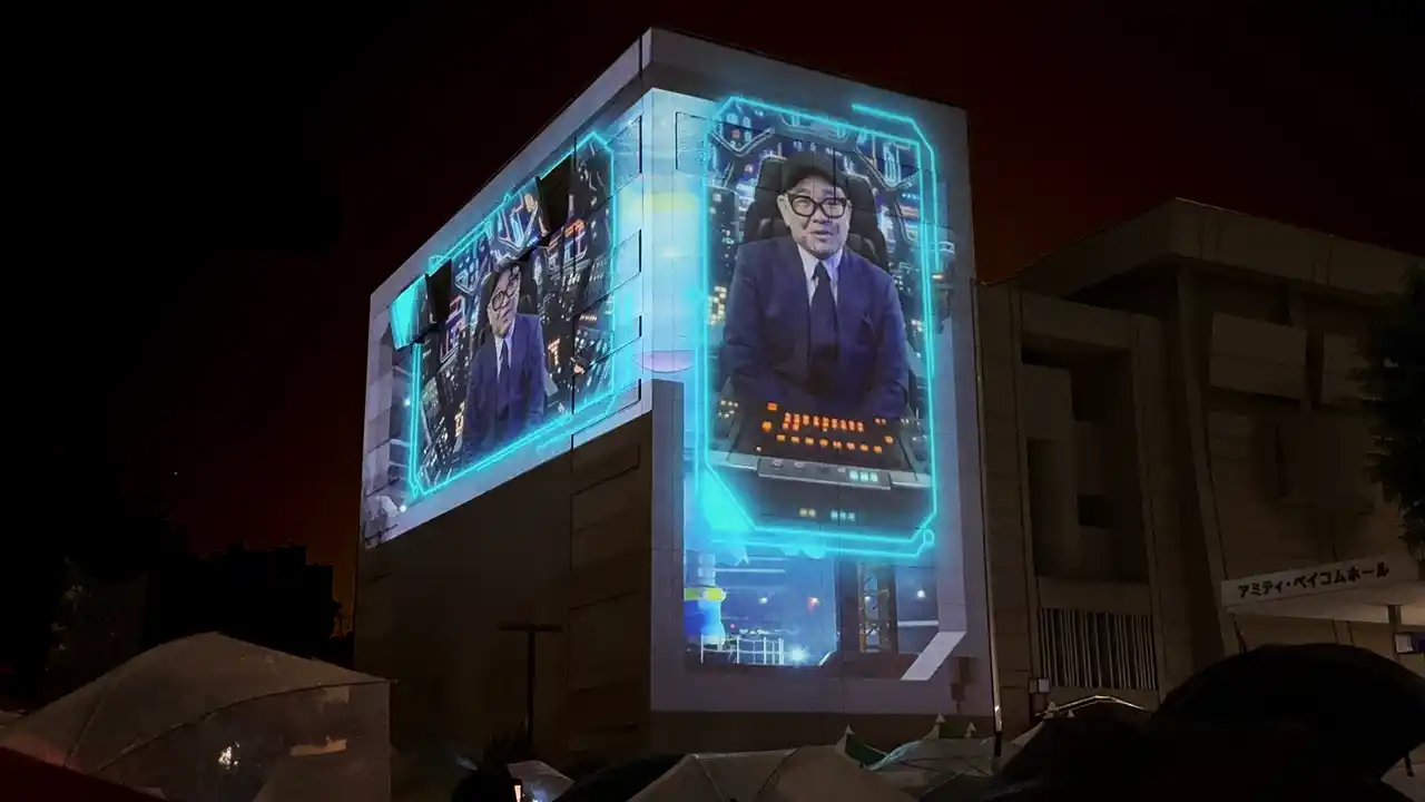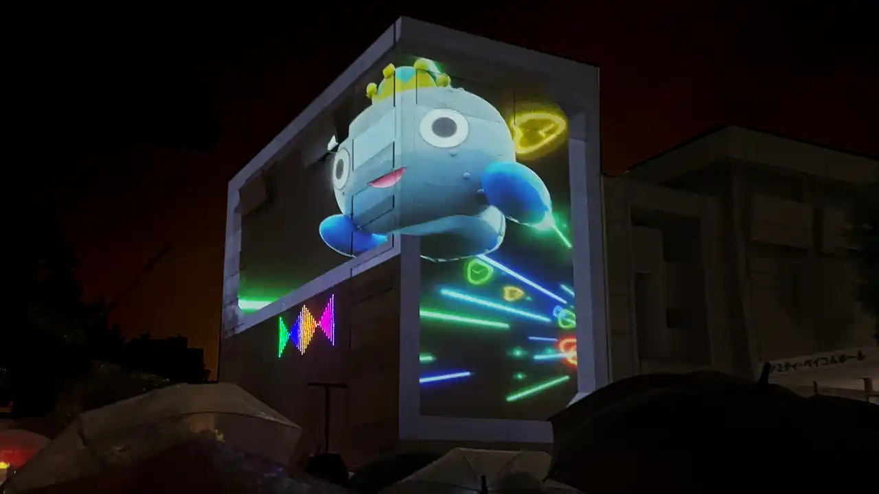 2025年10月25日(土)兵庫県西宮市で行われた、にしのみや市民祭りのフィナーレイベントとして、クリエイティブカンパニー(株)スピードがプロジェクションマッピングを実施。西宮市民会館(アミティ・ベイコムホール)東側・北側壁面に投影。地域で愛されるキャラクターみやたんに、タイムトラベル機能などを実装したメカみやたんを3DCGで制作、今回初登場となった。西宮市ええもんひろめ大使の兵動大樹氏がメカみやたんに乗り込み、昔の西宮をタイムトラベル。