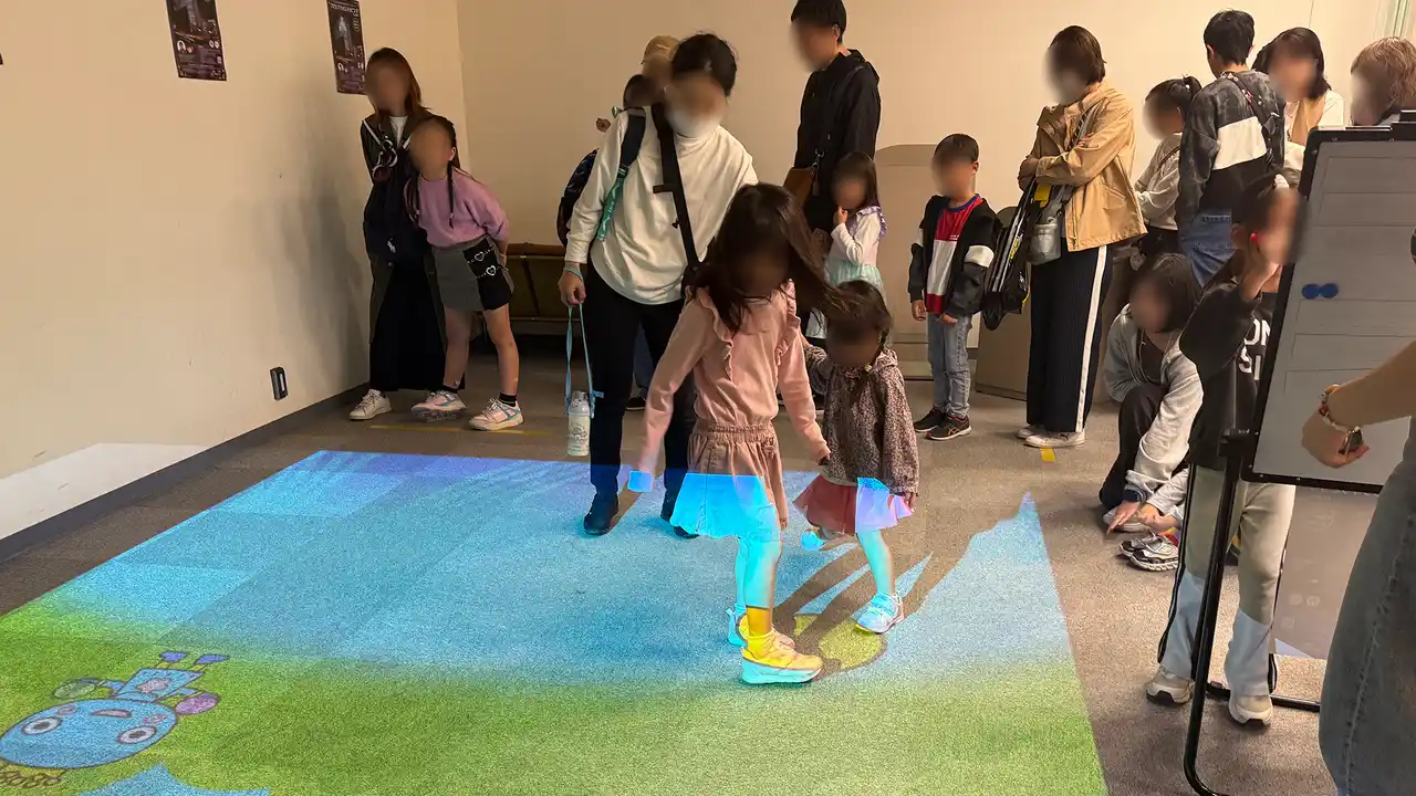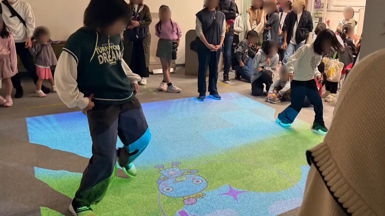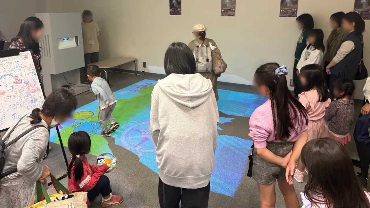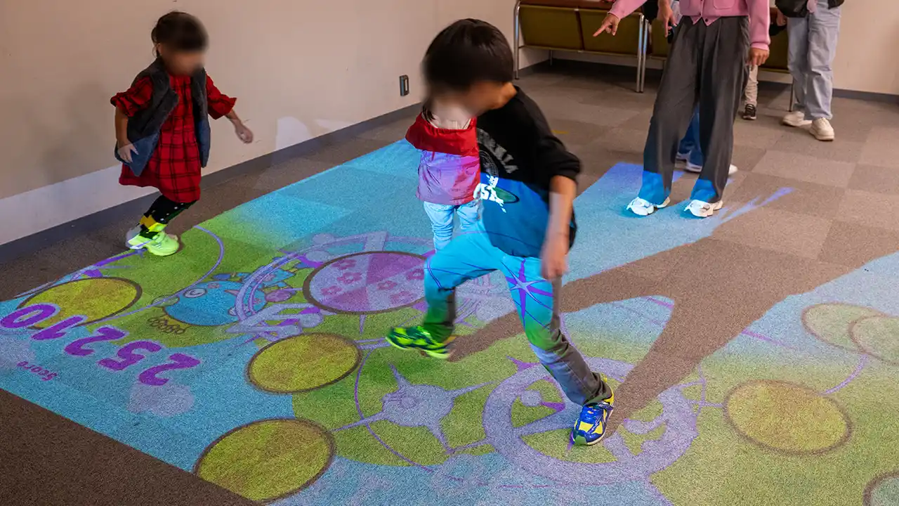 また、西宮市民会館内では、子どもコーナーの一角にデジタルブースを設置。(株)スピードオリジナルコンテンツ、タブレットでみやたんの塗り絵をすると3Dになって動き出す『お絵描きみやたん』や、足元に投影されたプレイエリアで、移動や足踏みをして楽しむゲーム『アシンキング』みやたんバージョンを実施。親子や友達同士などでの協力プレイも可能で、高得点を競い合った。 |